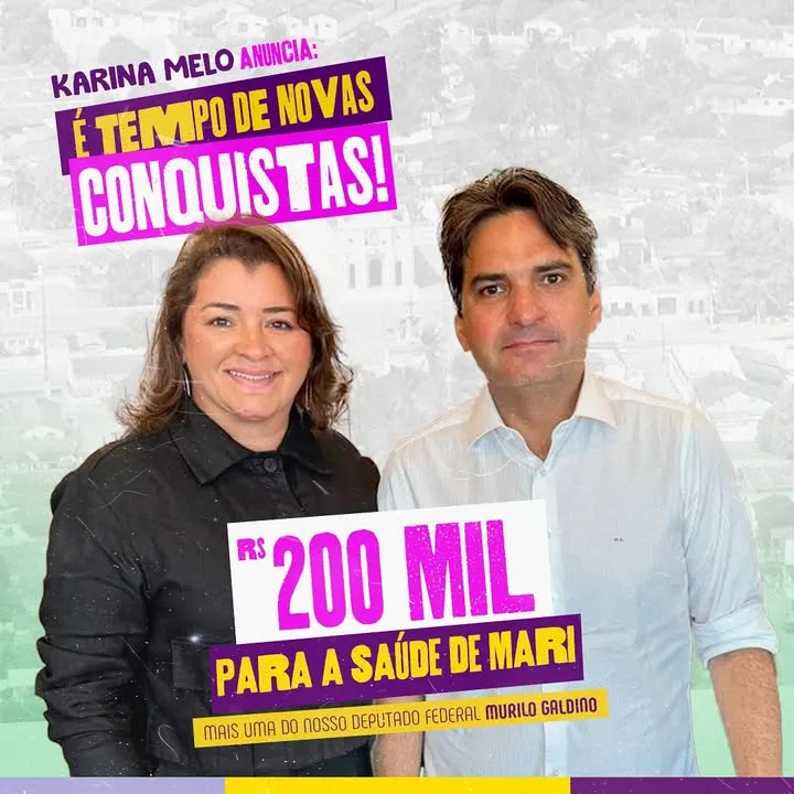 A ex-vice-prefeita e atual secretária de Administração de Marí, Karina Melo, anunciou por meio de suas redes sociais uma conquista de um recurso importante para o município. Através do mandato do deputado federal Murilo Galdino, a cidade foi contemplada com uma emenda parlamentar no valor de R$ 200 mil, destinada a fortalecer e melhorar os serviços de saúde.