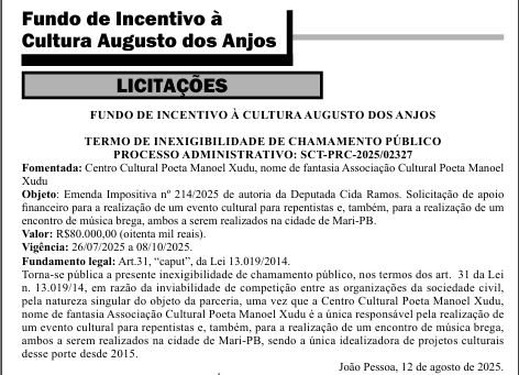 O Governo do Estado da Paraíba, por meio do Fundo de Incentivo à Cultura Augusto dos Anjos, oficializou a inexigibilidade de chamamento público para a execução de dois eventos culturais na cidade de Mari. A parceria será firmada com o Centro Cultural Poeta Manoel Xudu.