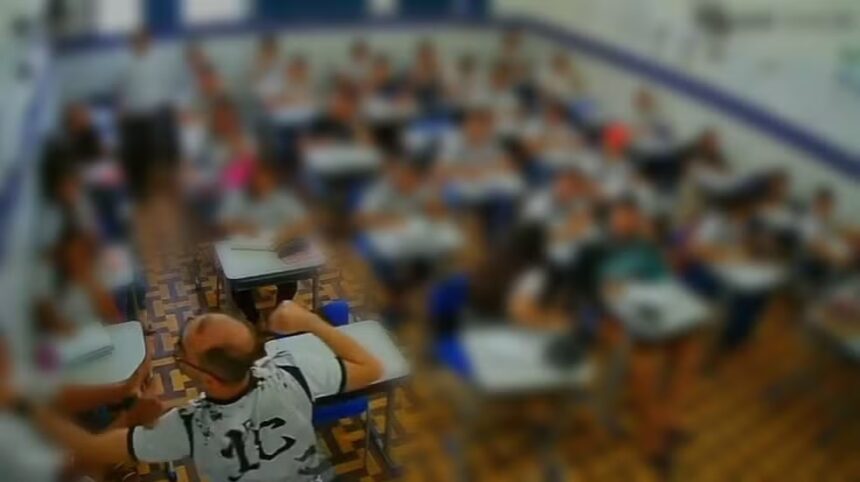 Uma câmera de segurança registrou o momento em que um professor agride um aluno, segurando o pescoço dele, em sala de aula, na tarde desta quarta-feira (20), na cidade de Aroeiras, no Agreste da Paraíba.