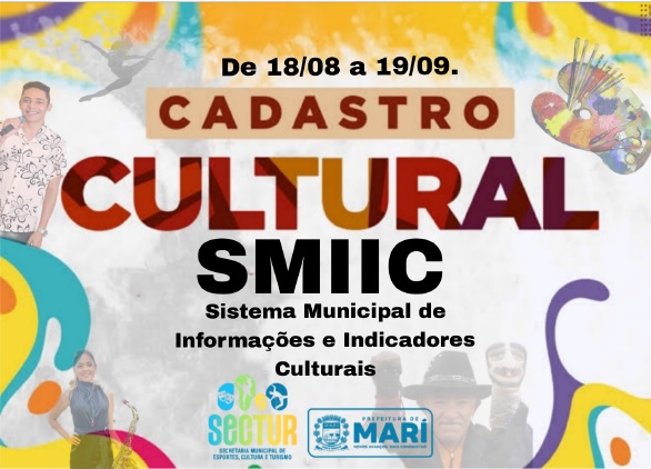 A Prefeitura de Mari, por meio da Secretaria Municipal de Cultura, sob a coordenação de Roberta Suênia, iniciou no dia 18 de agosto o Cadastro Cultural – SMIIC (Sistema Municipal de Informações e Indicadores Culturais). A ação segue até 19 de setembro e tem como objetivo mapear artistas, grupos, coletivos e instituições culturais do município, fortalecendo a construção do Sistema Municipal de Cultura (SMC).