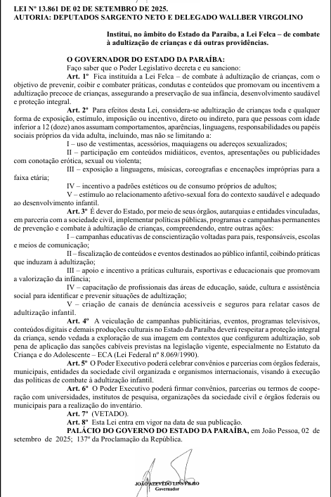 O governador da Paraíba, João Azevêdo (PSB), sancionou nesta quarta-feira (3) a Lei Felca, voltada à prevenção e combate à adultização de crianças no estado. A norma foi publicada no Diário Oficial do Estado (DOE) e tem como objetivo garantir a preservação da infância, o desenvolvimento saudável e a proteção integral das crianças.