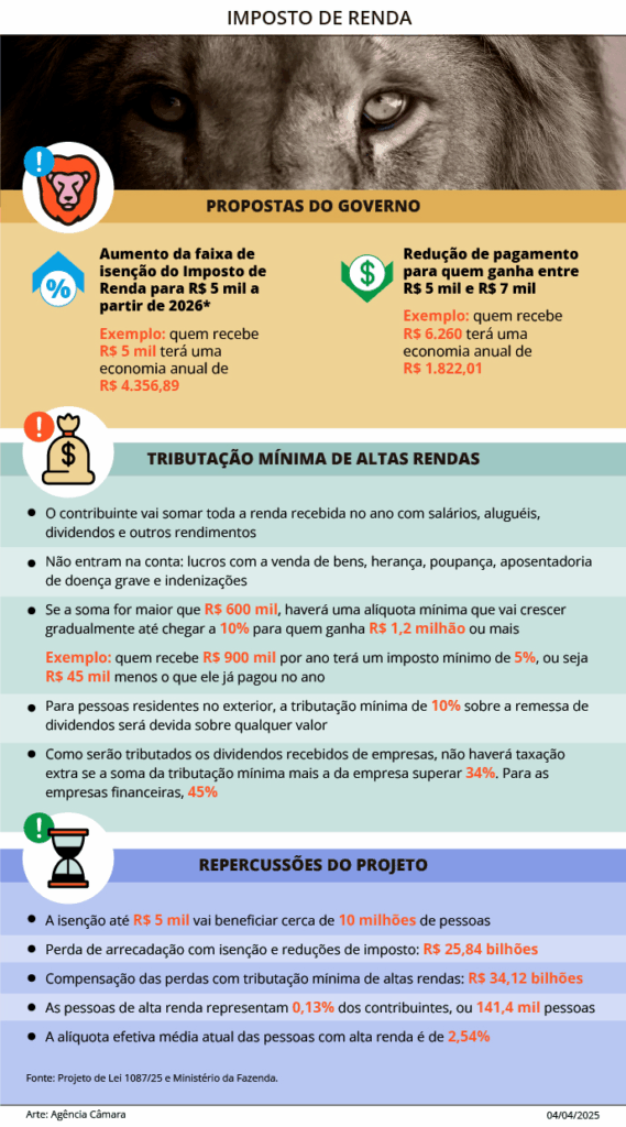 A proposta, encaminhada pelo governo em março, prevê que a renúncia fiscal – estimada em R$ 25,8 bilhões por ano – seja compensada pela tributação de contribuintes com renda anual superior a R$ 600 mil. De acordo com o Ministério da Fazenda, esse grupo representa apenas 0,13% do total de declarantes e hoje paga, em média, 2,54% de IR.