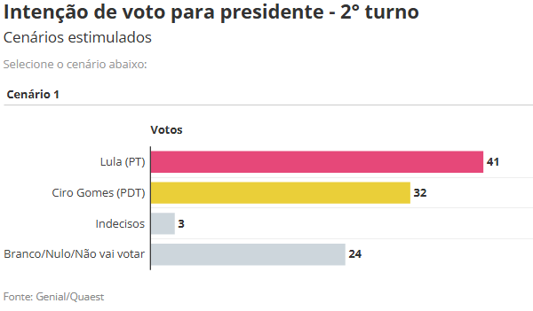 Em um eventual segundo turno, Lula mantém vantagem contra todos os seus possíveis adversários, com intenções de voto entre 41% e 47%. A menor diferença, de nove pontos percentuais, é contra o ex-ministro Ciro Gomes, do PDT, que teria 32% e é o único candidato que perderia por menos de 10 pontos percentuais.