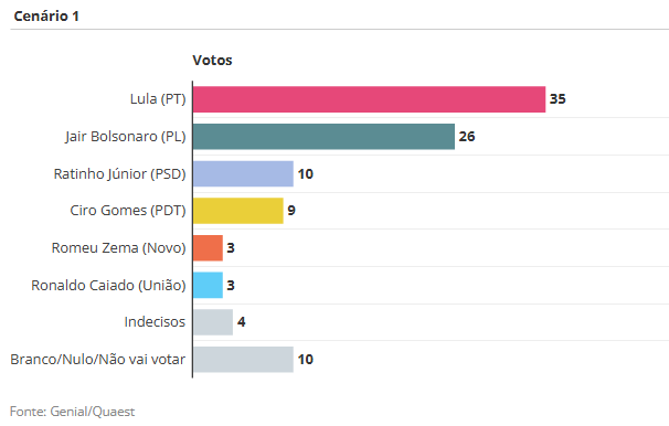 O ex-presidente Jair Bolsonaro (PL), que está inelegível e não pode participar do pleito, tem o melhor resultado contra o petista entre os nomes da direita testados. Bolsonaro teria 26%, contra 35% de Lula. A ex-primeira-dama Michelle Bolsonaro (PL), por sua vez, aparece com 21%, em um cenário no qual representa o campo, ante 36% do petista. Já o governador de São Paulo, Tarcísio de Freitas (Republicanos), soma 18% e 19%, a depender da lista de nomes, enquanto Lula marca, respectivamente, 39% e 42%.