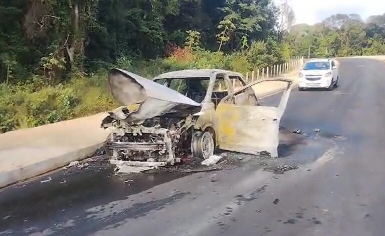 O carro foi abandonado e incendiado em um trecho ainda não liberado para o trânsito de veículos.
