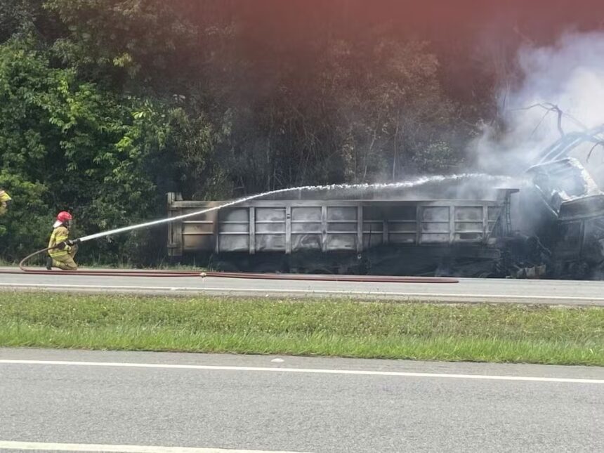 O subtenente Monteiro, da Polícia Militar, explicou que o motorista do caminhão informou que percebeu o início do incêndio e tentou tirar o cinto de segurança, mas perdeu o controle e atravessou a rodovia. A Polícia Militar passava pelo local no momento e conseguiu tirar o motorista do veículo a tempo.