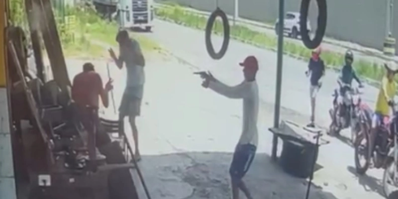 Imagens de uma câmera de segurança mostra que o alvo dos disparos, que morreu na hora, estava trabalhando e conversando com um colega no momento do crime.