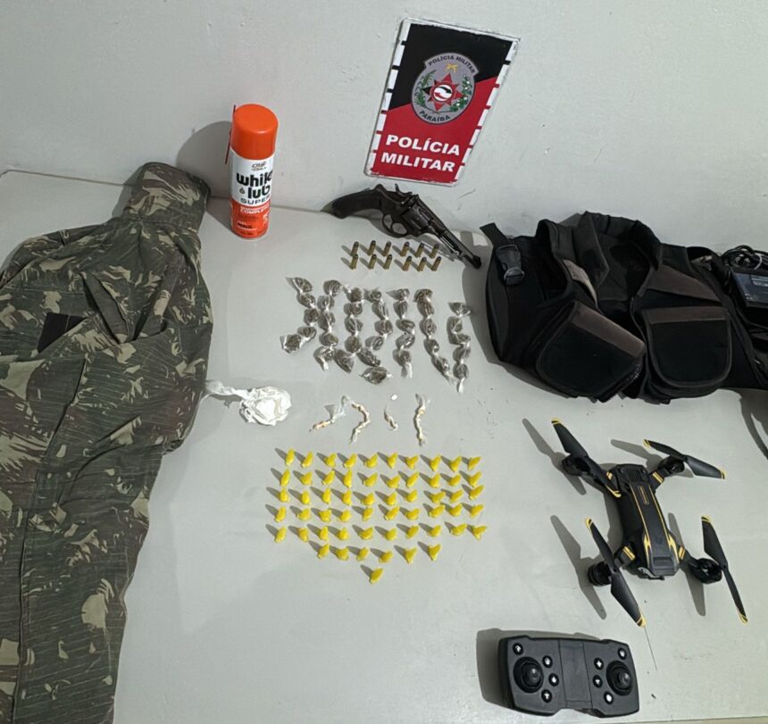 A Polícia Militar, por meio do Batalhão de Rondas Ostensivas de Natureza Especializada, desarticulou um ponto de apoio ao crime que foi instalado no Conjunto Júlia Paiva, na cidade de Cruz do Espírito Santo. Em uma operação na noite dessa segunda-feira (3), as equipes policiais prenderam no local um homem e apreenderam uma arma, munições, mais de 100 embalagens com drogas de três tipos, uma capa de colete balístico, uma roupa camuflada e até um drone que os criminosos usavam.
