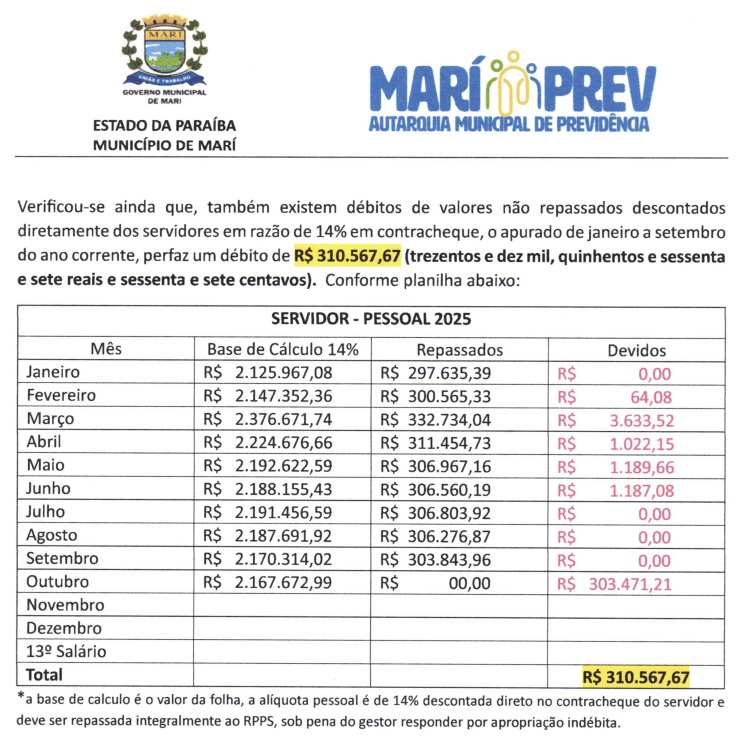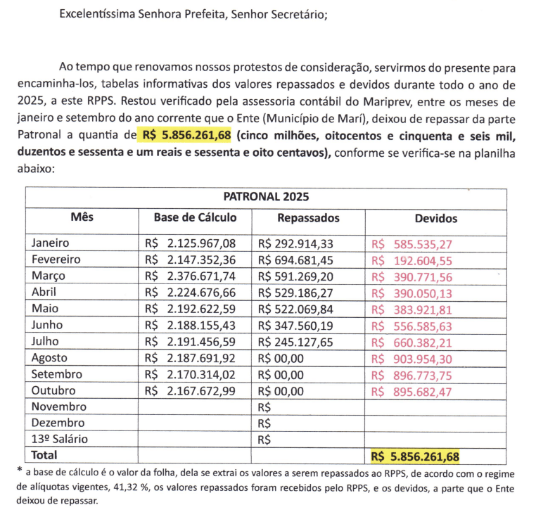 Segundo o documento, o município deixou de repassar R$ 5.856.261,68 referentes à parte patronal das contribuições previdenciárias de janeiro a setembro deste ano. Além disso, o Mariprev aponta que R$ 310.567,67 descontados diretamente dos contracheques dos servidores também não foram repassados ao fundo — o que pode configurar apropriação indébita previdenciária.