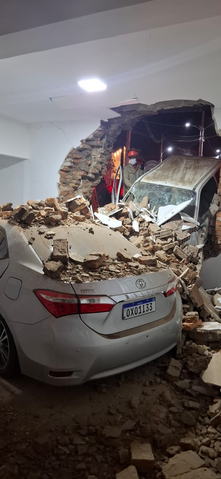 O impacto foi tão forte que o carro destruiu a parede e invadiu o interior da casa, precisamente na garagem, atingindo também o veículo que estava estacionado no local.