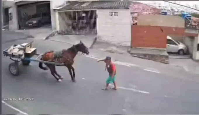 Um cavalo caiu após perder o controle da carroça que puxava, por não conseguir suportar o peso da carga, neste sábado (20), no bairro da Palmeira, em Campina Grande. Imagens de câmeras de segurança da rua onde ocorreu o incidente registraram o momento da queda.