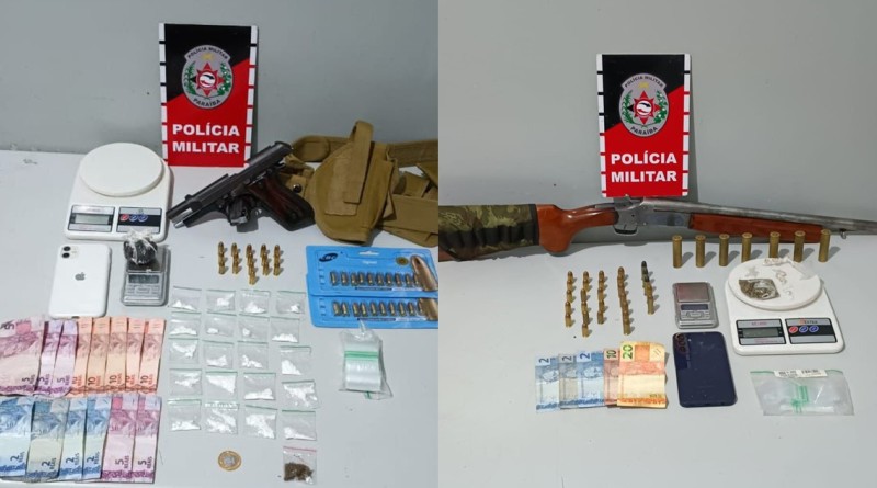 Já nesta madrugada, as equipes policiais realizavam o policiamento no bairro Alto do Cemitério, quando dois suspeitos fugiram ao perceber a presença policial. Após acompanhamento, os indivíduos foram alcançados e abordados. No local, foram apreendidos uma espingarda, calibre 28, munições de diferentes calibres, maconha, crack, balanças de precisão, dinheiro e materiais usados para embalar entorpecentes.