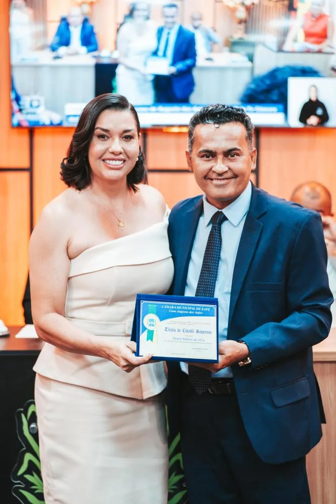 A concessão do Título de Cidadã Sapeense foi proposta pelo vereador Nego Simplício, enquanto a Medalha Comendador Augusto dos Anjos foi de autoria do vereador Dudu do Trigo. Durante a sessão, os vereadores homenagearam Denise e destacaram sua dedicação e o trabalho realizado em benefício da população de Sapé.