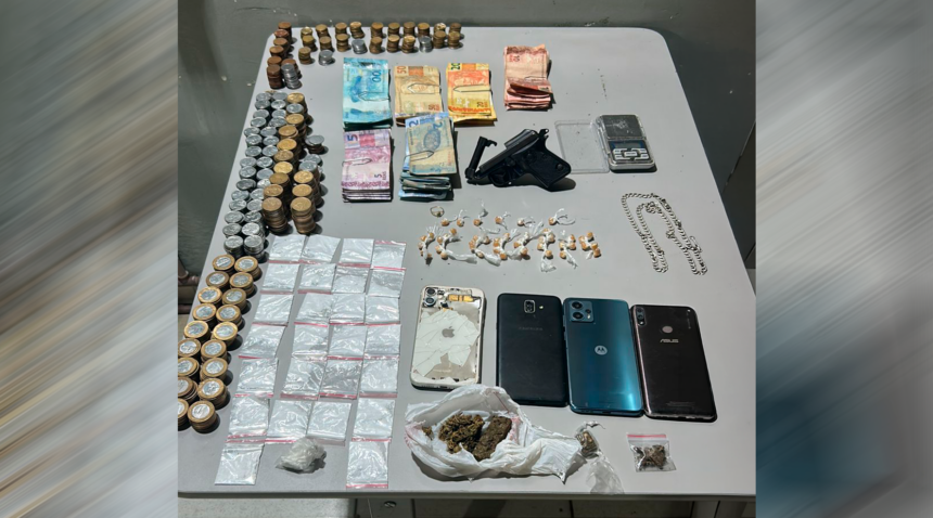 Durante o policiamento, a equipe visualizou um indivíduo em atitude suspeita nas imediações de um beco na comunidade. Ao perceber a aproximação da equipe, o suspeito fugiu deixando no local vários materiais ilícitos, como: porções de crack, maconha e cocaína, além de uma arma de fogo, dinheiro e cinco aparelhos celulares.