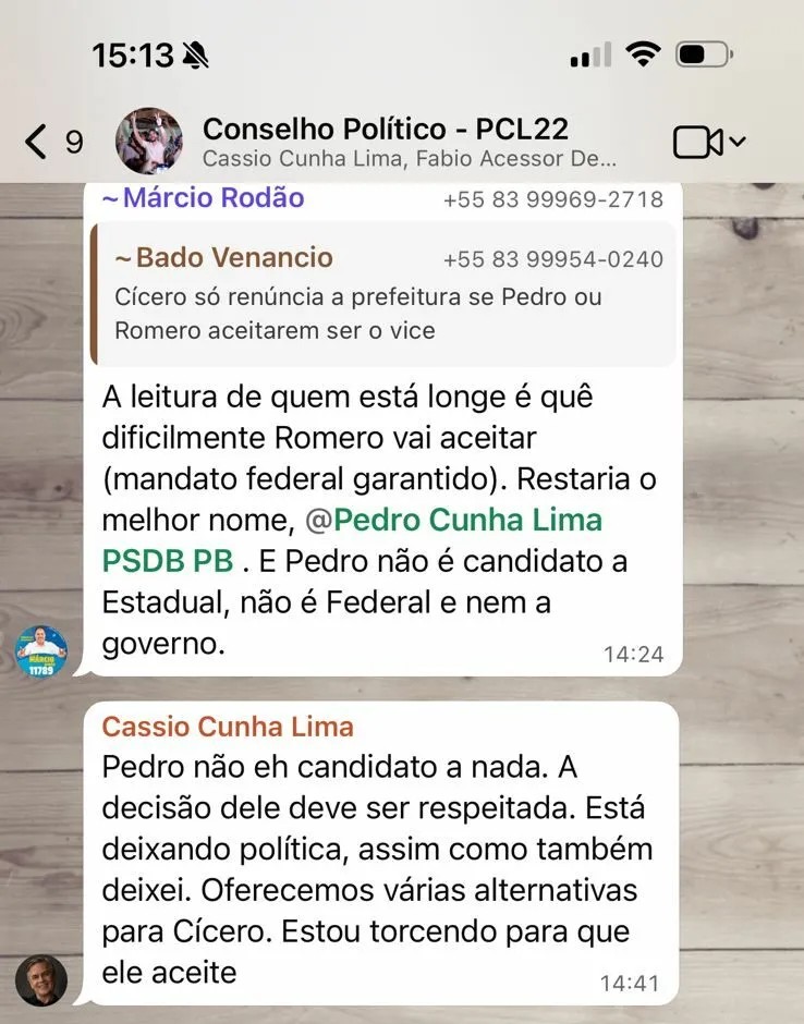 Se existia alguma dúvida sobre a participação de Pedro Cunha Lima nas eleições, como vice de Cícero Lucena, agora não há mais. Mensagem do ex-governador Cássio Cunha Lima em grupo de WhatsApp é categorica e dispensa comentários: