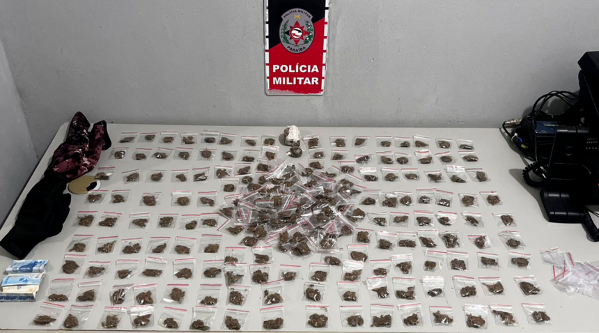 Na sacola foram encontradas 231 embalagens de maconha, 02 porções maiores da mesma drogas, além de dinheiro e balaclavas.