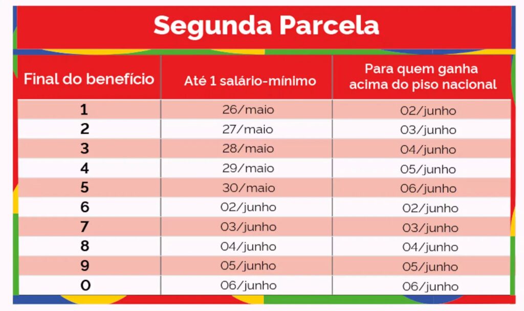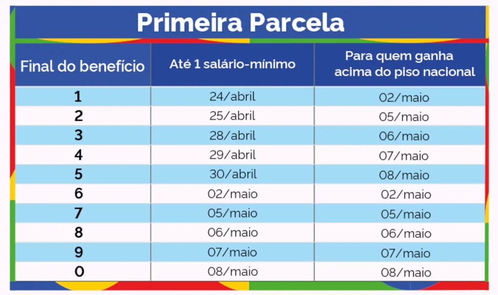 O calendário de pagamento da primeira parcela vai de 24 de abril até 8 de maio. A segunda metade do 13º será paga de 25 de maio a 8 de junho. Os pagamentos serão feitos conforme o número final do cartão de benefício, sem considerar o último dígito verificador, que aparece depois do traço.